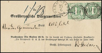1 Kr. grün im Paar (unten Scherentrennung) auf seltenem Nachnahmebrief von Darmstadt, 21.6.1867, nach Nieder-Gemünden