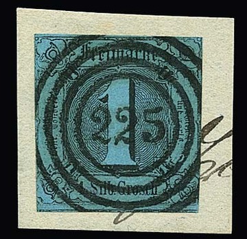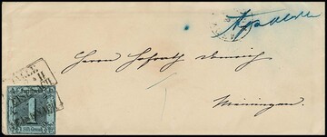 "225" (Blankenhain) als Vorausentwertung, gut erkennbar an dem Umstand, dass die Marke in den Ecken noch Originalgummi zeigt und völlig ursprünglich haftet, auf Briefstück mit 1 Sgr., ferner in schwarz und blau auf zwei losen Marken