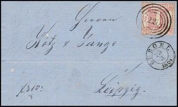 "226" nebst K2 "Bürgel" auf Prachtbrief 1 Sgr. rot (Fotoexp. Sem), sowie auf Couvert (leichte Gebrauchsspuren) mit 3 Sgr. (seltener Brief der 3. Gewichtsstufe nach Utzberg bei Vieselbach, rs. "6" Pfge. Landbestellgeld quittiert)