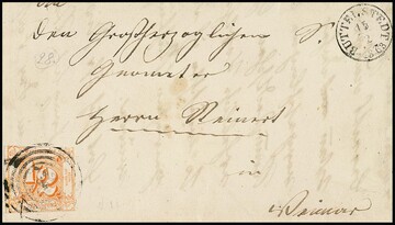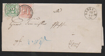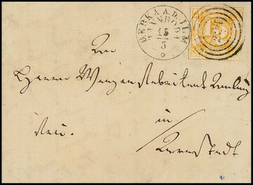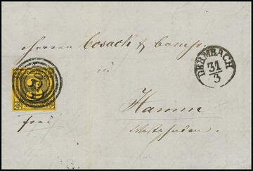 "230" nebst seltenem kleinem vorphil. K1 "Dermbach" (sonst immer der große K1, hier in zudem wahrscheinlich spätest bekannter Verwendung 1858) auf gefaltetem Brief mit riesenrandigem Luxusstück 3 Sgr. schw./dunkelgelb