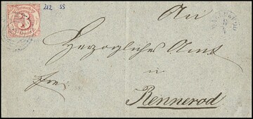 "211", typischer Abschlag, nebst K1 "Usingen" auf Faltbrief (ohne Seitenklappen) mit 1 und 3 Kr., Feuser + 500,-