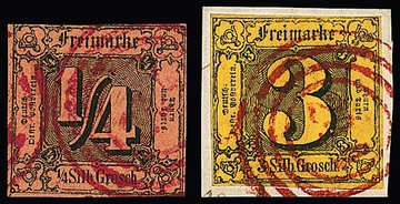 "244" (Stadtlengsfeld) in rot noch erkennbar auf 1/4 Sgr. schw./rotbraun (nur links oben leicht berührt), sowie sehr schön klar auf Briefstück 3 Sgr. schw./gelb (kleine Ausbesserung), sign. Sem bzw. für Nr. 6a tadelloses Attest Sommer. Sehr seltene Abstempelungen!