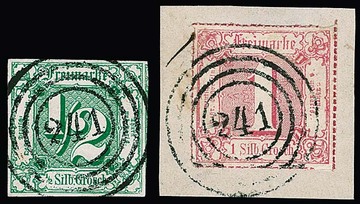 "241" (Ostheim) je sehr klar auf breitrandiger 1/2 Sgr. grün (kl. Mgl.) und auf Kabinettbriefstück 1 Sgr. rosa, je Fotoexp. Sem