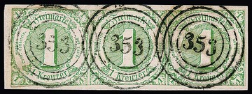 "357" nebst K1 "Obertiefenbach" auf drei Briefen, zweimal Paare 1 Kr. grün (etwas getönt) sowie Brief 1 u. 3 Kr.