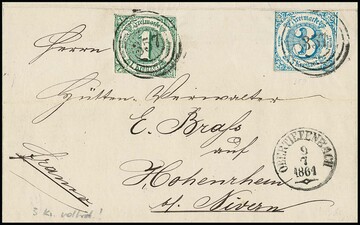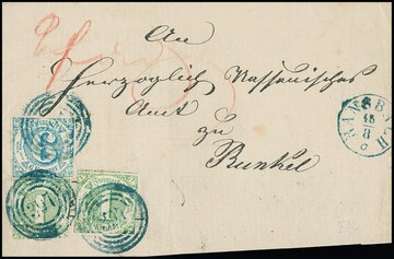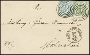 "397" nebst K1 "Ransbach", je in blau, klar auf Brief mit zweimal 1 Kr. grün und 6 Kr. hellblau (üblicher Schnitt)