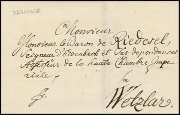 "Eisenach", 1790, seltener erster L1 "D` EISENACH" klar auf schwarz gerandeter Adelsbriefhülle mit Datumszeile nach Wetzlar. Feuser 838-01/600,-