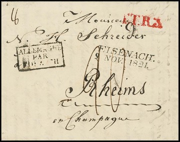 "Eisenach", (1820), seltener Schrägschrift-L1 (mit Punkt, nur kurz 1819/20 verwandt, Feuser nicht gelistet) auf Briefhülle. Dazu der Rayon-L1 1819 und L2 1841 auf zwei Briefen nach Frankreich, sowie L2 nebst rs. L1 "Nach Abgang der Post" auf Brief 1844 nach Wien