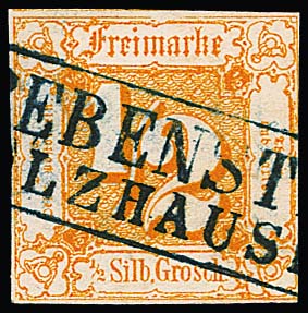 "Grebenstein-Holzhausen", dunkelblauer Postablage-Ra2 klar auf 1/2 Sgr. orange (kl. Mgl.), lt. Attest Haferkamp einzig bekanntes Stück in dieser Stempelfarbe!