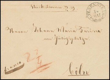 "Glücksbrunn 19/4 39", äusserst frühe handschriftliche Aufgabe 1839 der Briefsammlung/Postablage, nebst K1 "Liebenstein", auf Brief mit Inhalt an Farina/Köln. Sehr selten!