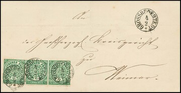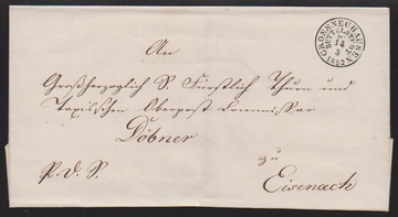 "Glücksbrunn bei", L1 1844 in Verbindung mit L2 "Eisenach" klar auf Brief (unten winzige Rand-Kerben) nach Langensalza. Seltener Stempel der Briefsammlung/Postablage, hier in sehr früher Verwendung!