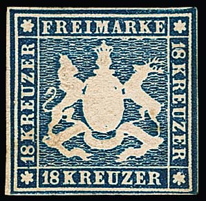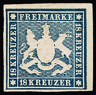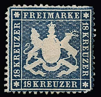 18 Kr. blau, ungebrauchtes Prachtstück, vollrandig geschnitten und in tiefer Farbe mit noch teilweise erhaltenem Originalgummi (dieser ganz leichte Patina im Wappenbereich). Eine seltene Marke in ungebr. Erhaltung, Fotoattest Heinrich. Mi. 4000,-