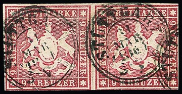 18 Kr. schw./violettgrau, waagerechtes Kabinettpaar, die linke Marke in Type II, die rechte Marke in Type I, vollrandig und in frischer Farbe. Jede Marke mit zentr. K3 "Mergentheim 9/8 55". Typenpaare der 18 Kr. sind nur wenige bekannt geworden, sign. Pfenninger, Fotoattest Heinrich