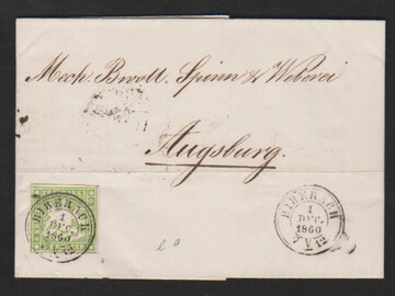 6 Kr. hellgrün, perfektes Exemplar auf gef. Brief 1860 mit K2 "Biberach"