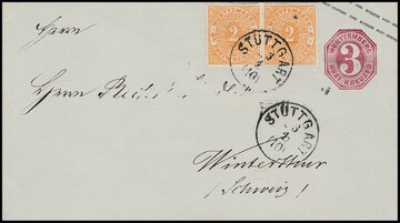 2 Kr. orange, farbtiefes Kabinettpaar auf Ganzsache 3 Kr. rosa (Adressname teils radiert und rs. obere Viertelklappe ganz gering verkürzt), mit K1 "Stuttgart" 1873 nach Winterthur/Schweiz. Seltene Darstellung des 7-Kr.-Portos, Attest Irtenkauf