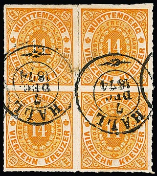 14 Kr. gelborange, oben geringfügig angetrennter Viererblock mit klaren K2 "Hall", oberes Paar rückseitig geringe Bearbeitungsspuren, von dieser Marke seltene Einheit! Attest Heinrich
