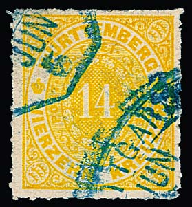 14 Kr. zitronengelb, Kabinettstück mit blauem Fächerstempel "Stuttgart II". Eine seltene Marke in perfekter Erhaltung, Fotoattest Heinrich. Mi. 2000,-