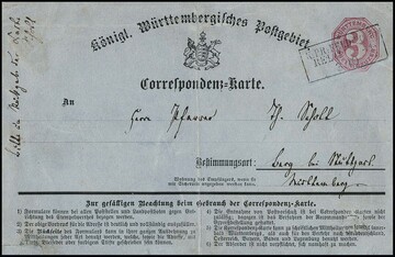 Verwendung einer württembergischen Correspondenzkarten-Ganzsache bei der Feldpost im Deutsch-Französischen Krieg: 3 Kr., etwas fehlerhafte Karte, datiert "Sarrebourg, den 2/10 1870", mit Postauflieferung bei dem dort stationierten preuss. Feldpost-Relais, adressiert nach Berg bei Stuttgart. Klarer Ra3 "K. PR. FELD-POST RELAIS No. 4 3/10". Obwohl in den besetzten Gebieten Frankreichs die Okkupationsmarken (Elsass-Lothringen) gültig waren, wurden in aller Regel auch Frankaturen Altdeutscher Staaten anerkannt. Derartige Belege sind ausserordentlich selten und nur in wenigen Stücken bekannt geworden, Fotoattest Spalink ("große Seltenheit, ein begehrenwertes Stück und in dieser Kombination wahrscheinlich Unikat")