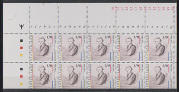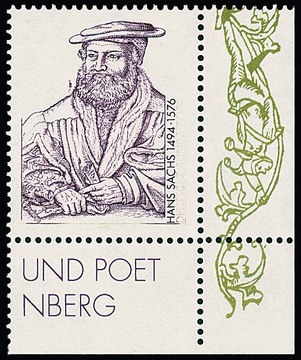 100 Pfg. Hans Sachs, postfrische rechte untere Bogenecke mit Abart "ohne Inschrift und Wertangabe"