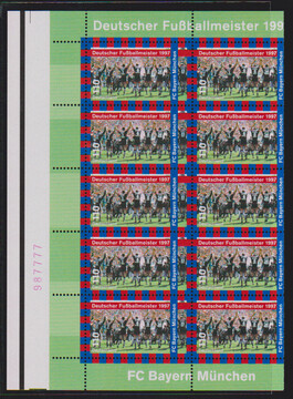 110 Pfg. Bayern München, zwei völlig verschnittene Zehnerbögen postfrisch mit unterschiedlichen Randdrucken links und roter bzw. grüner Rand-Nr.
