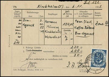 30 Pfg. Posthorn in seltener Verwendung auf postalischer Gebührenmeldung über zu wenig bezahltes Porto für ein NN-Paket aus Bremen-Vegesack 1953