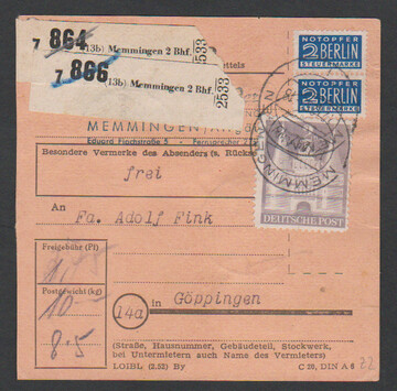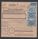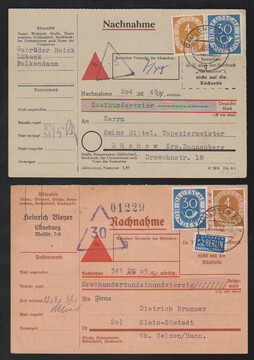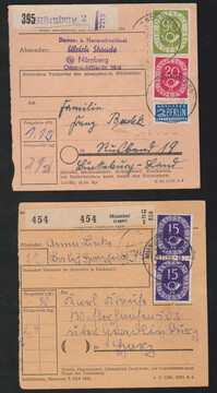 Zwei Paketkarten mit waagerechten Posthorn-Paaren: 30 Pfg. im Paar vom Oberrand, nebst Einzelstück und 50 Pfg., ferner 60 Pfg. im Paar nebst 5 u. 50 Pfg. sowie 2 DM Bauten, vs./rs., Mi. 800,- +