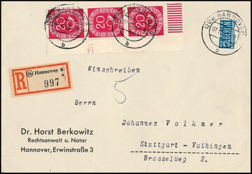 20 Pfg. Posthorn im Dreierstreifen aus der linken unteren Bogenecke (im Rand Abklatsch des Druckerzeichens "2" neg.) auf Bedarfs-R-Brief aus Hannover