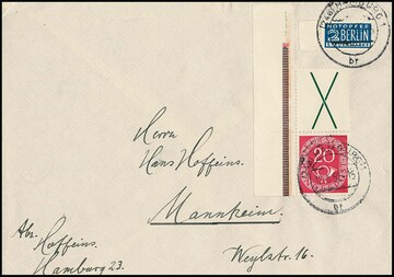 20 Pfg. Posthorn, senkrechtes postfrisches rechtes Randpaar mit Druckerzeichen "2" neg. (ein Wert kl. Spalt), dazu 4 Pfg. im Viererblock aus der linken oberen Bogenecke mit DZ "8" neg. und vollem Originalgummi, so dass der Bahnpoststempel "Kassel-Bebra" möglicherweise ein nachträglicher Gefälligkeitsstempel ist (lt. Notiz Schlegel nicht mit Sicherheit als echt zu bestätigen)
