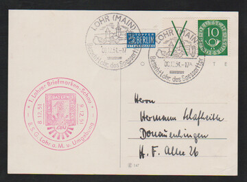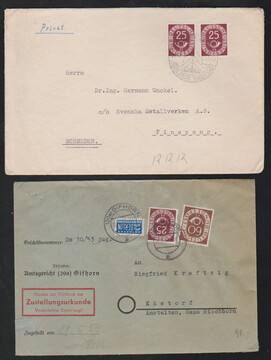 Zwei Ganzsachenkarten 20 Pfg. Posthorn bzw. Heuss je als portoger. Auslandskarten gebraucht, Mi. 130,-