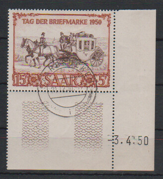 15 Fr. Tag der Briefmarke, rundgestempelte rechte untere Bogenecke mit Druckdatum, Mi. 500,-