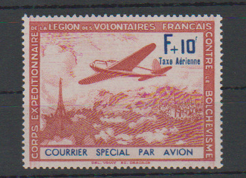 Legionsausgaben, Flugpost-Vignette F + 10 F. postfrisch mit Plattenfehler V, Mi. 200,-, Fotoexp. Pieles