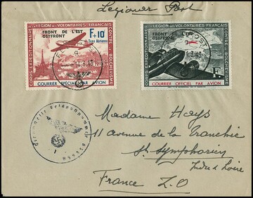 Legionsausgaben, Flugpost-Vignette + 10 Fr., nebst kpl. Serie "Legionäre an der russischen Front", auf Feldpostbrief mit FP-Stempel vom 20.10.42 an eine FP-Nr. mit rs. Ankunftsstempel
