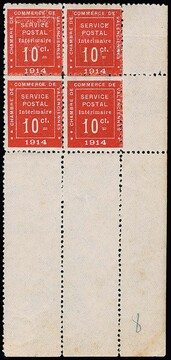 1914, Handelskammer Valenciennes, 10 C. rosa im postfrischen Viererblock aus der rechten unteren Bogenecke mit breiten Rändern. Seltene Einheit dieser lose schon gesuchten Marke. Mi. 5200,- ++