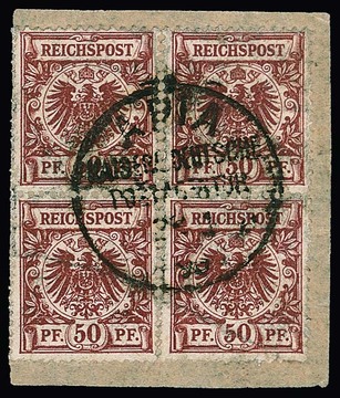 Vorläufer Krone-Adler 50 Pfg. braunrot im Viererblock auf Briefstück mit klarem K1 von Apia, 4.2.92. Die linke obere Marke links gering bestoßene Zähnchen, sonst gut. Attest Steuer. Mi. lose 2000,- +