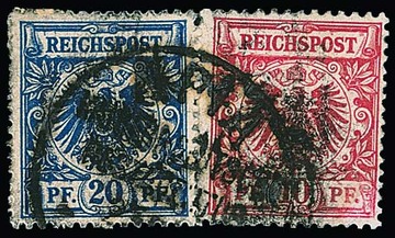 Vorläufer Krone-Adler 50 Pfg. braunrot im Paar (linker Wert winziger Eckbug) mit K1 von Apia, sign. Steuer. Mi. 1000,-