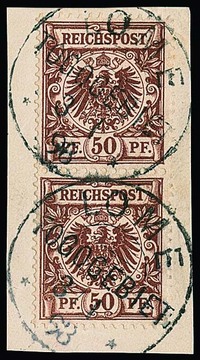 Vorläufer Krone-Adler 50 Pfg. rötlichbraun, gute Farbe, waagerechtes Paar (winzige Zahnverkürzungen) und senkrechtes Paar (überdurchschnittlich gute Erhaltung) auf Briefstück mit klarem K1 Apia" aus 1892. Attest Steuer. Mi. lose 2000,-