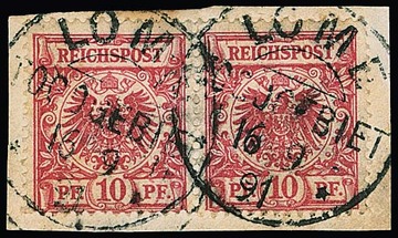 Vorläufer Krone-Adler 10 Pfg. in guter Nuance rosarot im Paar auf kleinem Briefstück mit Stempel "Lome" v. 16.9.91. Attest Jäschke-L. "fehlerfrei". Mi. lose 2200,-