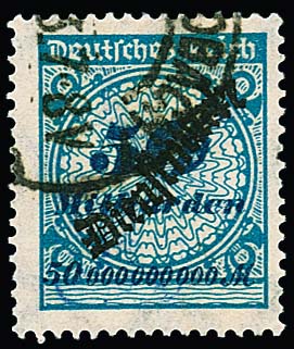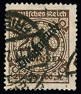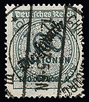 100 Mill. Mk., Plattenfehler "Sprung in der Rosette" (Haupttype) zentrisch gestempelt "Charlottenburg". Mi. 800,-, drei kleine Zahnspitzenverkürzungen, gut sign. Oechsner mit Attest