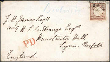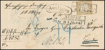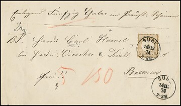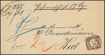 2 1/2 Gr. lilabraun, übliche Zhg., als Einzelfrankatur auf Postvorschußbrief über 17 Sgr. nach Kiel, klarer K2 "Preetz 4/10 73" nebst Auslagen-Stempel, Fotoattest Krug. Mi. 1200,-