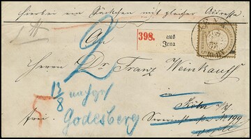 5 Gr. ockerbraun, Prachtstück einzeln auf Paketbegleitcouvert (dieses kleine Öffnungsmgl.), mit Ablöse-K1 "Jena" nach Köln und von dort mit rs. seltenem Hufeisenstempel nach Bad Godesberg weitergesandt. Fotoexp. Hennies
