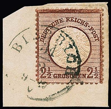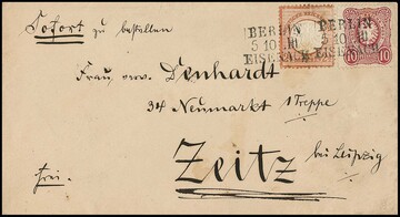 2 1/2 Gr. rotbraun (zwei kleine Spalte) in Währungsmischfrankatur mit 10 Pfge. rosa (kleine Zahnkerbe) auf Bahnpost-Expreßcouvert mit Zug-L3 "Berlin-Eisenach" vom 5.10.1875. Sehr späte Verwendung der Nr. 21 in der zweiten Jahreshälfte 1875 auf einem Bahnpost-Expreßbrief (typische Gebrauchsspuren), Attest Brugger