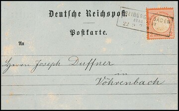 2 Kr. orange einzeln auf etwas getönter Privatpostkarte mit Ra3 von Freiburg. Sign. Drahn, Kruschel und Attest Krug "in einwandfreier Erhaltung". Mi. 4500,-