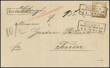 5 Gr. ockerbraun als Einzelfrankatur auf rekommandiertem Kabinettbrief nach Turin, klare Ra3 "Dresden Stadt-Post-Exped. No. 6". Ein seltener, eingeschriebener Italien-Brief mit dieser Einzelfrankatur, Fotoexp. Brugger