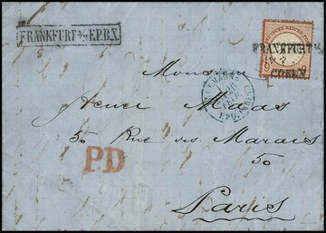 9 Kr. rotbraun (einige verkürzte Zahnspitzen) einzeln auf Bahnpost-Brief nach Paris, Entwertung durch Bahnpost-L3 "Frankfurt/M.-Coeln" nebst Aufgabe-Ra1 "Frankfurt E.P.B.X.", Fotoattest Krug. Mi. 800,-