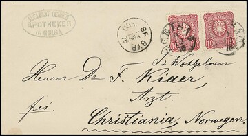 Zwei Briefe aus gleicher Korrespondenz je mit Doppelfrankatur 10 Pfge. von einem Apotheker in Geisa an einen Arzt in Christiania/Norwegen: 1876 mit spät nachverw. Taxis-Zier-K1 (und seltenem Byp.-Neben-K1), sowie 1879 mit neuem K1