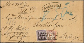 2 1/2 a. 2 1/2 Gr. rotbraun in Währungs-Mischfrankatur mit 5 Pfge. lila, Kabinettstücke mit Ra3 "Beuthen i. Oberschlesien 27/10 75" auf sauberem Auslagenbrief, sign. Starauschek, Wiegand-Hb. S. 114