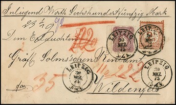 2 1/2 a. 2 1/2 Gr. rotbraun, Plattenfehler "gebrochenes H", in Währungs-Mischfrankatur mit 5 Pfge. violett (unauffällige Aufklebefehler) mit zentr. K2 "Leipzig" 1875 auf Einschreibebrief nach Frankfurt/a.M. mit erstem amtl. R-Zettel der Reichspost, seltener Brief, Fotoexp. Krug, Wiegand-Hb. S. 104