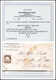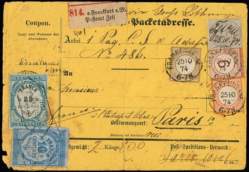 18 Kr. ockerbraun, Luxusstück in perfekter Zähnung, nebst 10 Gr. grau, 2 Kr. orange und 9 a. 9 Kr. rötlichbraun (diese mit kl. verwendungsbed. Beanstandungen) auf kpl. gelber Paketkarte (u.a. gestützte Falte und radierter Empfängername) nach Paris. Klare, zentrische K1 "Frankfurt a.M. 25/10 74", links unten mit zwei franz. Steuermarken zu 10 und 25 C. Ein seltenes Ganzstück mit einer tadellosen 18 Kr. gr. Brustschild, Fotoatteste Hennies, Brugger