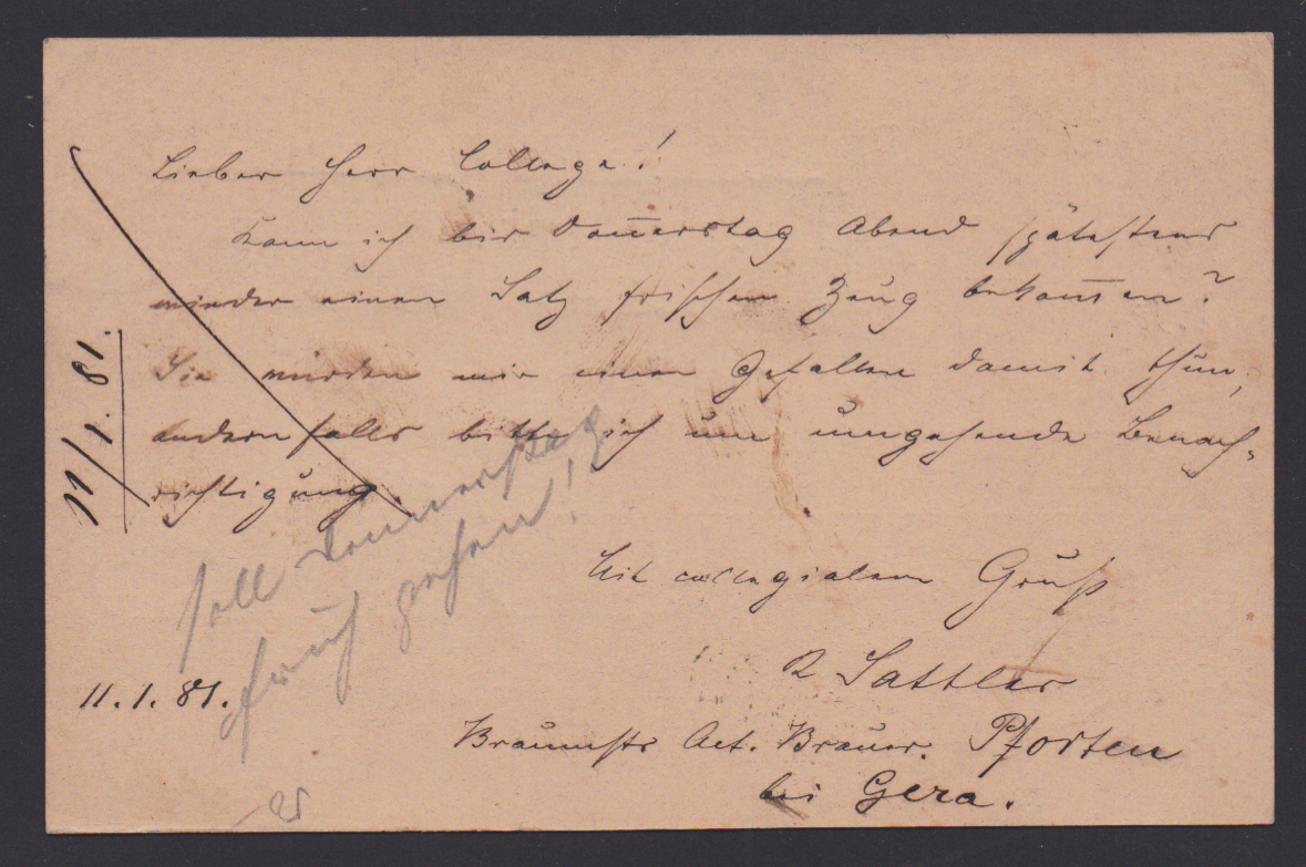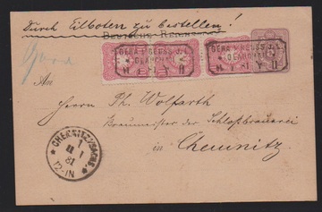 10 Pfg. im Dreierstreifen auf Bahnpost-Expreßkarte 5 Pfg. 1881, als interessante Überfrankatur mit hs. Aufgabe "Gera" und BP-Ra3 "Gera-Reuss i.L./Glauchau"
