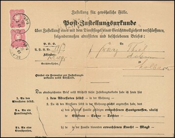 10 Pfg. rosa per zwei in ungewöhnlicher Verwendung innen auf Postinsinuations-Dokument (übliche Falten, dort etwas eingerissen) mit K1 "St. Avold" 1880, Anschriftenseite mit "20" Pfg. Nachporto belegt