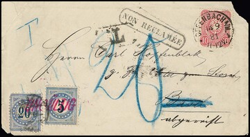 Drei unterfrankierte Briefe in die Schweiz mit Schweizer Nachportomarken: mit Viererstreifen 5 Pfg. und Nachportomarke 50 Rp. aus Kiel 1887, ferner mit Paar 10 Pfg. auf Doppelbrief mit Nachporto 50 Rp., sowie 10 Pfg. auf Couvert (Gebrauchsmgl.) von Offenbach mit Nachportomarken 5 und 20 Rp., jedoch retour und deshalb roter L1 "Ungültig", mit rs. Eröffnungssiegel-Vignette der OPD Darmstadt